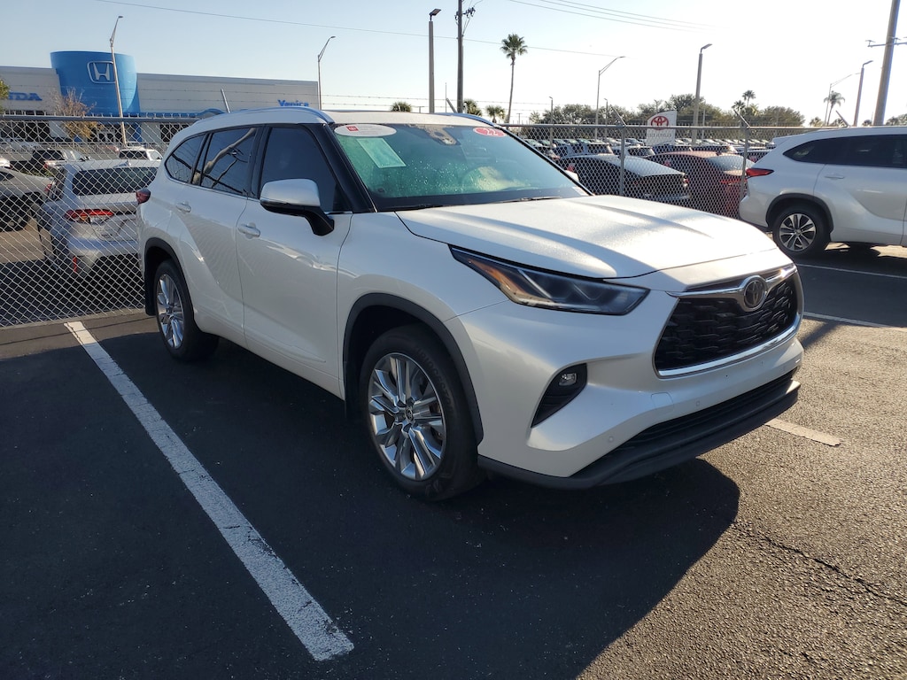 2022 Toyota Highlander 3.5L V6 DOHC Wind Chill Pearl This vehicle also comes equipped with: Toyota Gold Certified Certified, 11 Speakers, 3.003 Axle Ratio, 3rd row seats: split-bench, 4-Wheel Disc Brakes, ABS brakes, Air Conditioning, Alloy wheels, AM/FM radio: SiriusXM, Apple CarPlay/Android Auto, Auto High-beam Headlights, Auto-dimming Rear-View mirror, Automatic temperature control, Brake assist, Bumpers: body-color, Chrome wheels, Delay-off headlights, Driver door bin, Driver vanity mirror, Dual front impact airbags, Dual front side impact airbags, Electronic Stability Control, Emergency communication system: Safety Connect with 1-year trial, Exterior Parking Camera Rear, Four wheel independent suspension, Front anti-roll bar, Front Bucket Seats, Front Center Armrest, Front dual zone A/C, Front fog lights, Front reading lights, Fully automatic headlights, Garage door transmitter: HomeLink, Heated door mirrors, Heated front seats, Heated steering wheel, Heated/Ventilated Front Bucket Seats, Illuminated entry, Knee airbag, Leather Seat Trim, Leather Shift Knob, Low tire pressure warning, Memory seat, Navigation system: Dynamic Navigation (3-year trial), Occupant sensing airbag, Outside temperature display, Overhead airbag, Overhead console, Panic alarm, Passenger door bin, Passenger vanity mirror, Power door mirrors, Power driver seat, Power Liftgate, Power moonroof, Power passenger seat, Power steering, Power windows, Radio: Premium Audio w/JBL Clari-Fi, Rear air conditioning, Rear anti-roll bar, Rear reading lights, Rear window defroster, Rear window wiper, Reclining 3rd row seat, Remote keyless entry, Roof rack: rails only, Security system, Speed control, Speed-sensing steering, Split folding rear seat, Spoiler, Steering wheel mounted audio controls, Tachometer, Telescoping steering wheel, Tilt steering wheel, Traction control, Trip computer, Turn signal indicator mirrors, Variably intermittent wipers, Ventilated front seats, and Wheels: 20 Chrome Alloy. FWD 8-Speed Automatic Recent Arrival! Odometer is 14949 miles below market average! 21/29 City/Highway MPG