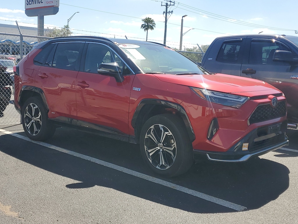 2023 Toyota RAV4 Prime 2.5L 4-Cylinder DOHC Supersonic Red/Midnight Black Metallic 3-Spoke Heated Leather Steering Wheel, Rain Sensing Wipers w/De-Icer Function, Weather Package. This vehicle also comes equipped with: Weather Package (3-Spoke Heated Leather Steering Wheel and Rain Sensing Wipers w/De-Icer Function), Toyota Certified Used Hybrids Certified, 11 Speakers, 19 Alloy Wheels, 4-Wheel Disc Brakes, ABS brakes, Air Conditioning, Alloy wheels, AM/FM radio: SiriusXM, Auto High-beam Headlights, Auto-dimming Rear-View mirror, Automatic temperature control, Axle Ratio: TBD, Brake assist, Bumpers: body-color, Delay-off headlights, Driver door bin, Driver vanity mirror, Dual front impact airbags, Dual front side impact airbags, Electronic Stability Control, Emergency communication system: Safety Connect (10-year trial), Exterior Parking Camera Rear, Four wheel independent suspension, Front anti-roll bar, Front Bucket Seats, Front Center Armrest, Front dual zone A/C, Front reading lights, Fully automatic headlights, Garage door transmitter: HomeLink, Heated door mirrors, Heated front seats, Heated Front Sport Seats, Illuminated entry, JBL Audio System, Knee airbag, Leather Shift Knob, Low tire pressure warning, Mixed Media Seat Trim, Navigation system: Drive Connect Cloud Navigation (1-year trial subscription), Occupant sensing airbag, Outside temperature display, Overhead airbag, Overhead console, Panic alarm, Passenger door bin, Passenger vanity mirror, Power door mirrors, Power driver seat, Power Liftgate, Power moonroof, Power steering, Power windows, Radio data system, Rear anti-roll bar, Rear seat center armrest, Rear window defroster, Rear window wiper, Remote keyless entry, Security system, Speed control, Speed-sensing steering, Split folding rear seat, Spoiler, Steering wheel mounted audio controls, Telescoping steering wheel, Tilt steering wheel, Traction control, Trip computer, Turn signal indicator mirrors, and Variably intermittent wipers. AWD CVT Recent Arrival!