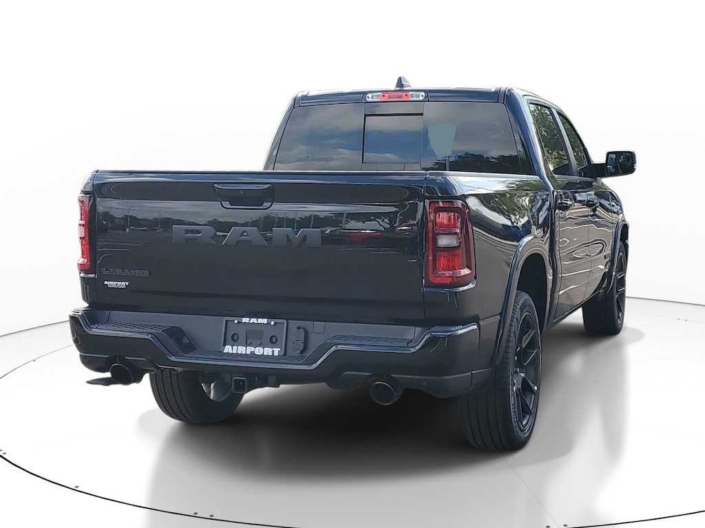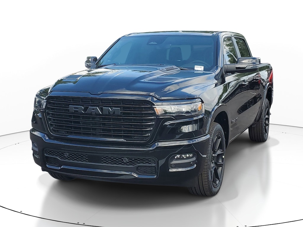 This Vehicle comes equipped with: Bed Utility Group (Exterior 115V AC Outlet, MOPAR 4 Adjustable Cargo Tie-Down Hooks, and MOPAR Spray in Bedliner), Laramie Level 1 Equipment Group (Rain Sensitive Windshield Wipers and Remote Tailgate Release), Night Edition (Accent Color Door Handles, Accent Color Premium Power Mirrors, Accent Color Tailgate Handle, Anti-Spin Differential Rear Axle, Auto Power-Folding Mirrors, Auto-Dimming Exterior Driver Mirror, Black Exterior Truck Badging, Black Headlamp Bezels, Black Interior Accents, Black Painted Exterior Mirrors Caps, Black Tail Lamp Bezels, Body Color Front Bumper, Body Color Rear Bumper with Step Pads, Convex Wide-Angle Exterior Mirror Insert, Dual Exhaust with Black Tips, Exterior Mirrors Approach Lamps, Exterior Mirrors Courtesy Lamps, Exterior Mirrors with Heating Element, Exterior Mirrors with Memory, Exterior Mirrors with Supplemental Signals, Grille Surround 3 Black Texture 2 Black, Pirelli Brand Tires, Proximity Approach/Departure Lamps, RAM Grille Badge - Black, Sport Performance Hood, and Wheels: 22 x 9 Forged Aluminum), Quick Order Package 21H Laramie, 10 Speakers, 3.21 Rear Axle Ratio, 4-Wheel Disc Brakes, 4G LTE Wi-Fi Hot Spot, ABS brakes, Adjustable pedals, Air Conditioning, Alloy wheels, AM/FM radio: SiriusXM with 360L, Apple CarPlay/Android Auto, Audio memory, Auto High-beam Headlights, Auto-dimming door mirrors, Auto-dimming Rear-View mirror, Automatic temperature control, Brake assist, Bumpers: chrome, Chrome Exterior Mirrors, Compass, Connected Travel and Traffic Services, Connectivity - US/Canada, Delay-off headlights, Driver door bin, Driver vanity mirror, Dual front impact airbags, Dual front side impact airbags, Electronic Stability Control, Exterior Parking Camera Rear, Front anti-roll bar, Front Bucket Seats, Front Center Armrest w/Storage, Front dual zone A/C, Front fog lights, Front License Plate Bracket, Front reading lights, Front wheel independent suspension, Fully automatic headlights, Garage door transmitter, GPS Navigation, Heated door mirrors, Heated front seats, Heated rear seats, Heated steering wheel, Illuminated entry, Integrated Center Stack Radio, Integrated Voice Command with Bluetooth, Leather steering wheel, Leather Trimmed Bucket Seats, Low tire pressure warning, Manufacturer's Statement of Origin, Memory seat, MOPAR Front and Rear Rubber Floor Mats, MyFlexCare Service Plan, Navigation System, Occupant sensing airbag, Outside temperature display, Overhead airbag, Overhead console, Panic alarm, Passenger door bin, Passenger vanity mirror, Pedal memory, Power door mirrors, Power driver seat, Power passenger seat, Power steering, Power windows, Radio data system, Radio: Uconnect 5 Navigation with 12.0 Display, RAM Grille Badge - Chrome, Rear anti-roll bar, Rear reading lights, Rear seat center armrest, Rear step bumper, Rear Wheelhouse Liners, Remote keyless entry, Security system, SiriusXM Radio Service, SiriusXM with 360L, Speed control, Split folding rear seat, Steering wheel mounted audio controls, Tachometer, Telescoping steering wheel, Tilt steering wheel, Traction control, Trip computer, Turn signal indicator mirrors, USB Host Flip, Variably intermittent wipers, Ventilated front seats, Voltmeter, and Wheels: 20 x 9 Premium Paint/Polish.