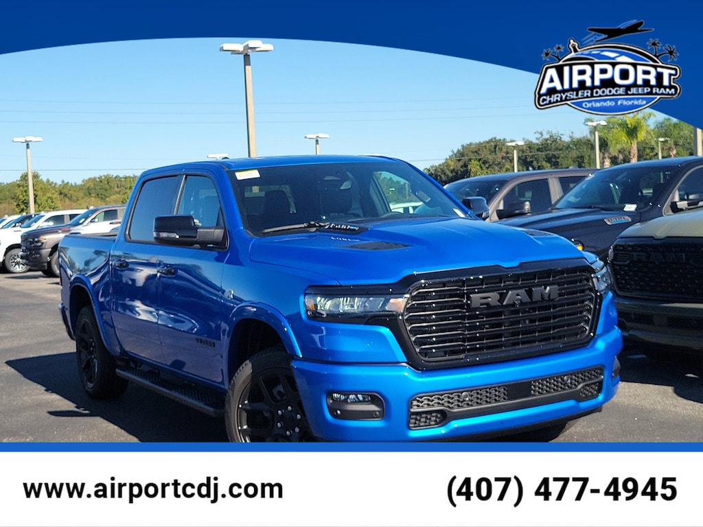 This Vehicle comes equipped with: Bed Utility Group (Exterior 115V AC Outlet, MOPAR 4 Adjustable Cargo Tie-Down Hooks, and MOPAR Spray in Bedliner), Laramie Level 2 Equipment Group (14.4 Touchscreen Display, 4G LTE Wi-Fi Hot Spot, Cluster 12 TFT Color Display, Connected Travel and Traffic Services, Connectivity - US/Canada, Front Passenger Interactive Display, GPS Navigation, Harman/Kardon 19 Speaker Premium Sound, Integrated Center Stack Radio, Integrated Voice Command with Bluetooth, Power Tailgate, Radio: Uconnect 5 Nav with 14.4 Display, Rain Sensitive Windshield Wipers, SiriusXM Radio Service, SiriusXM with 360L, and USB Host Flip), Night Edition (Accent Color Door Handles, Accent Color Premium Power Mirrors, Accent Color Tailgate Handle, Anti-Spin Differential Rear Axle, Auto Power-Folding Mirrors, Auto-Dimming Exterior Driver Mirror, Black Exterior Truck Badging, Black Headlamp Bezels, Black Interior Accents, Black Painted Exterior Mirrors Caps, Black Tail Lamp Bezels, Body Color Front Bumper, Body Color Rear Bumper with Step Pads, Convex Wide-Angle Exterior Mirror Insert, Dual Exhaust with Black Tips, Exterior Mirrors Approach Lamps, Exterior Mirrors Courtesy Lamps, Exterior Mirrors with Heating Element, Exterior Mirrors with Memory, Exterior Mirrors with Supplemental Signals, Grille Surround 3 Black Texture 2 Black, Pirelli Brand Tires, Proximity Approach/Departure Lamps, RAM Grille Badge - Black, Sport Performance Hood, and Wheels: 22 x 9 Forged Aluminum), Quick Order Package 27H Laramie, 10 Speakers, 33 Gallon Fuel Tank, 4-Wheel Disc Brakes, ABS brakes, Active Noise Control System, Air Conditioning, Alloy wheels, AM/FM radio: SiriusXM with 360L, Apple CarPlay/Android Auto, Audio memory, Auto High-beam Headlights, Auto-dimming door mirrors, Auto-dimming Rear-View mirror, Automatic temperature control, Brake assist, Bumpers: chrome, Chrome Exterior Mirrors, Compass, Delay-off headlights, Driver door bin, Driver vanity mirror, Dual front impact airbags, Dual front side impact airbags, Electronic Stability Control, Front anti-roll bar, Front Bucket Seats, Front Center Armrest w/Storage, Front dual zone A/C, Front fog lights, Front License Plate Bracket, Front reading lights, Front wheel independent suspension, Fully automatic headlights, Garage door transmitter, Heated door mirrors, Heated front seats, Heated rear seats, Heated steering wheel, Illuminated entry, Leather steering wheel, Leather Trimmed Bucket Seats, Low tire pressure warning, Manufacturer's Statement of Origin, Memory seat, MOPAR Front and Rear Rubber Floor Mats, MyFlexCare Service Plan, Navigation System, Occupant sensing airbag, Off-Road Information Pages, Outside temperature display, Overhead airbag, Overhead console, Panic alarm, ParkView Rear Back-Up Camera, Passenger door bin, Passenger vanity mirror, Power door mirrors, Power driver seat, Power passenger seat, Power steering, Power windows, Radio data system, Radio: Uconnect 5 Navigation with 12.0 Display, RAM Grille Badge - Chrome, Rear anti-roll bar, Rear reading lights, Rear seat center armrest, Rear step bumper, Remote keyless entry, Security system, Speed control, Split folding rear seat, Steering wheel mounted audio controls, Tachometer, Telescoping steering wheel, Tilt steering wheel, Traction control, Trip computer, Turn signal indicator mirrors, Variably intermittent wipers, Ventilated front seats, Voltmeter, and Wheels: 20 x 9 Premium Paint/Polish.